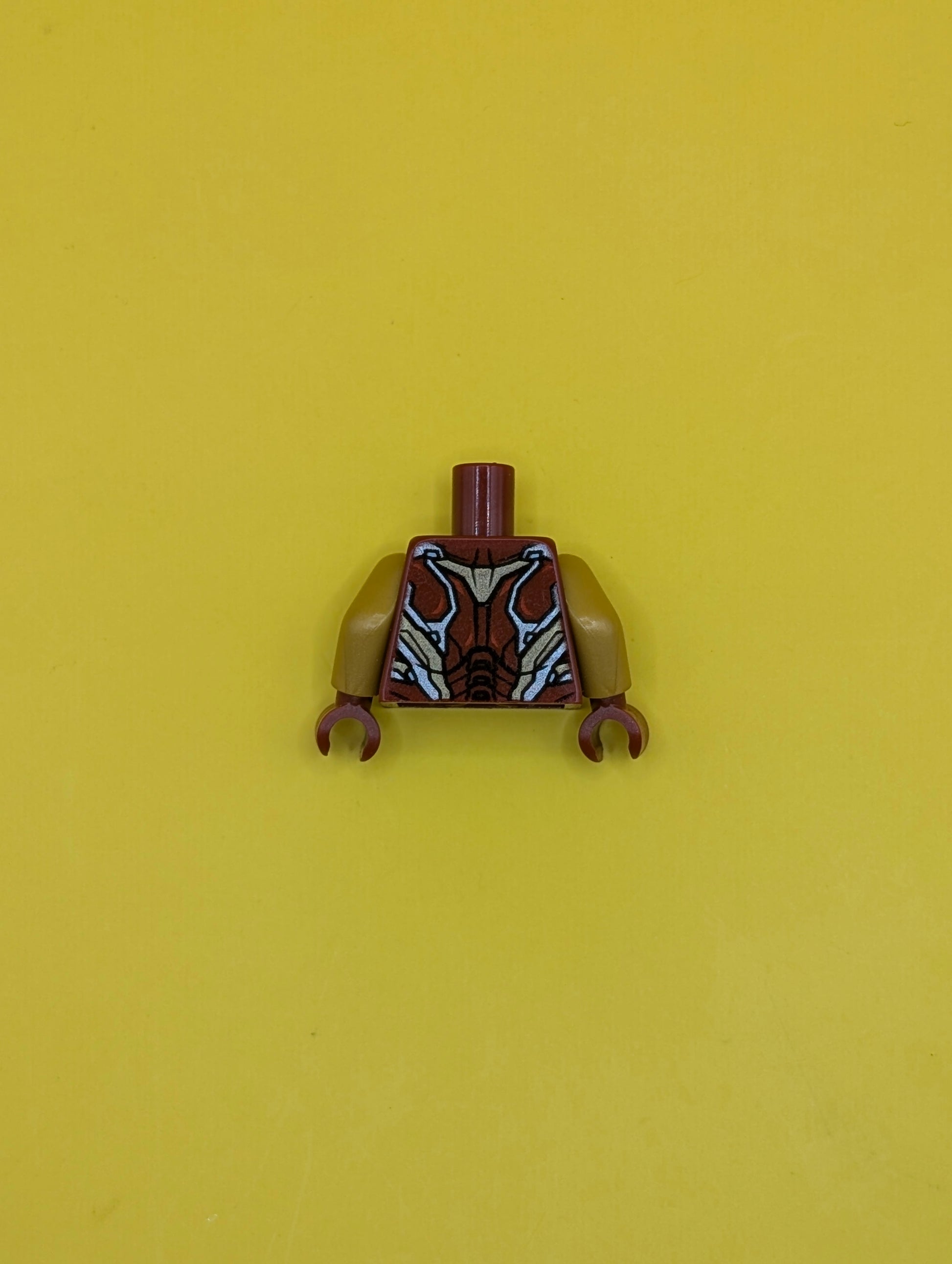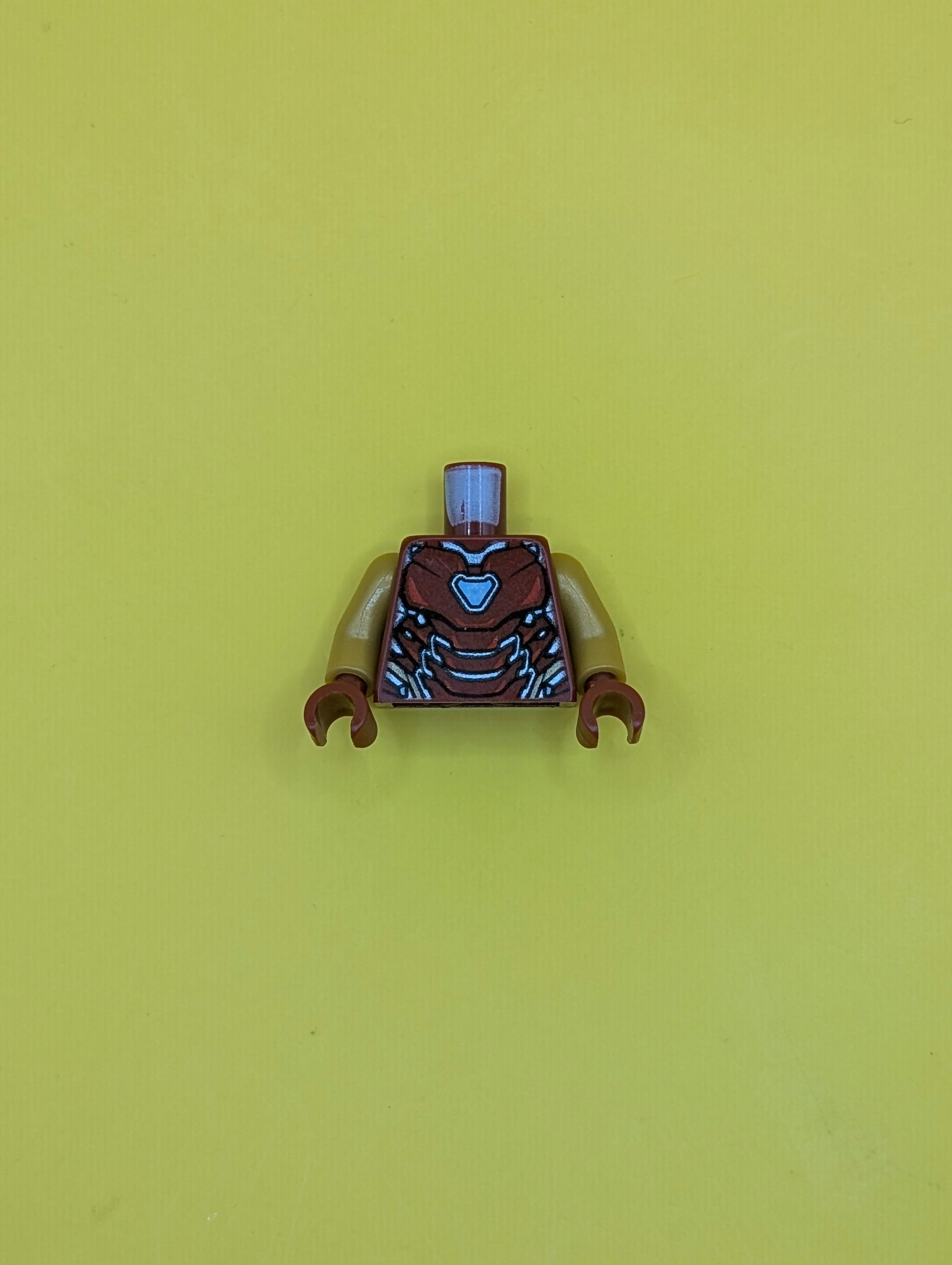973pb3503c01 Torso Armor with Thin Red Markings, Bright Light Blue Triangular Arc Reactor, Silver and Gold Trim Pattern / Pearl Gold Arms / Dark Red Hands Lego Part