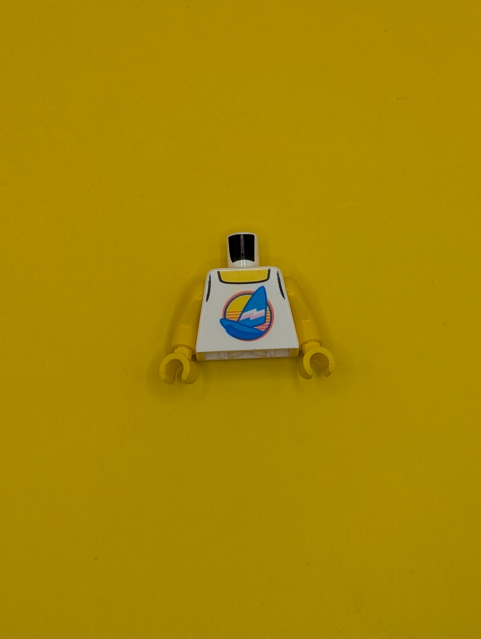973pb3572c01 Torso Tank Top with Dark Azure Sailboat with Bright Pink and White Stripes in Circle, Yellow Neck Pattern / Yellow Arms / Yellow Hands Lego Part