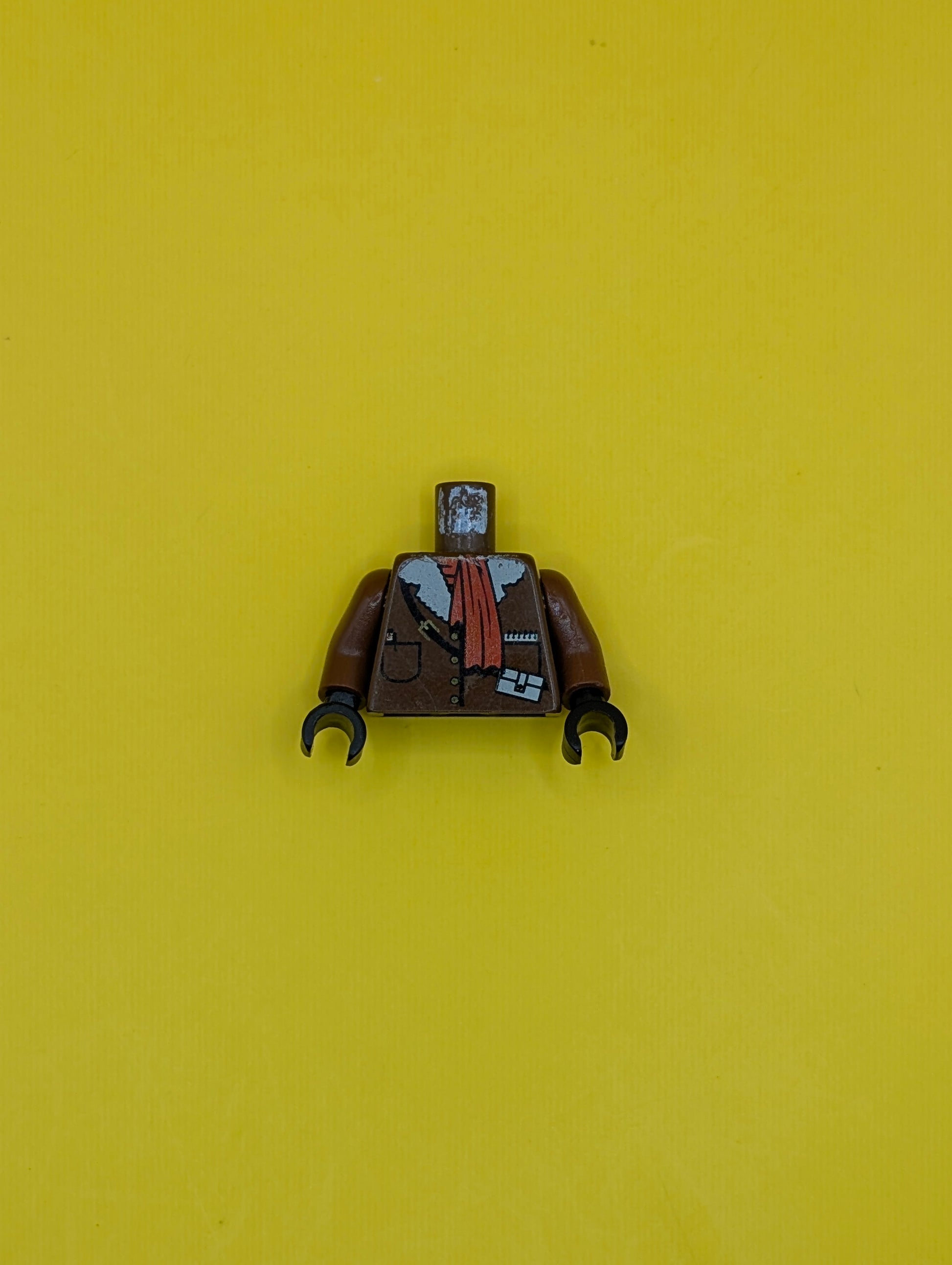 Torso Jacket with Buttons, Pockets, and White Fur Collar, Black Strap with Pouch and Yellow Buckle, Red Scarf, Pen, Notepad Pattern / Brown Arms / Black Hands 973px179c01 Lego
